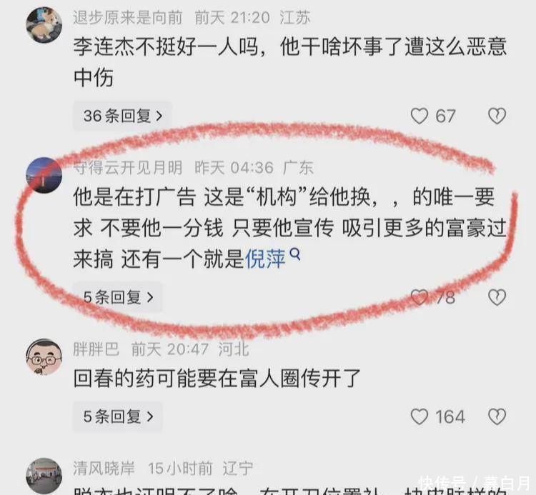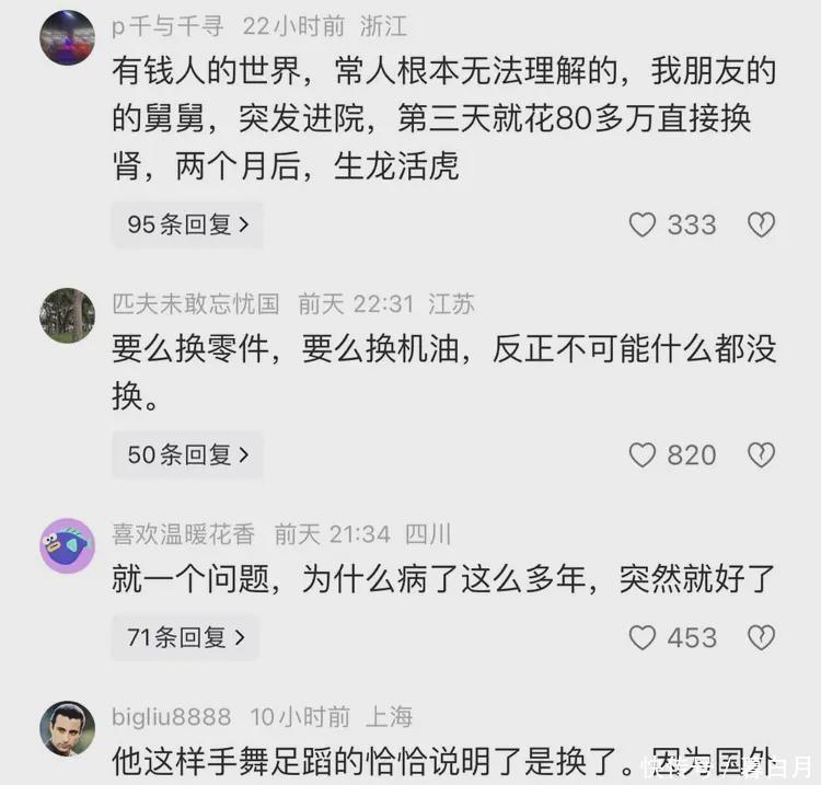 针对此事,有网友评论,有钱人的世界,常人根本无法理解的,我朋友的的舅舅,突发进院,第三天就花80多万直接换肾,两个月后,生龙活虎。有网友一针见血,要么换零件,要么换机油,反正不可能什么都没换。有网友表示,他是在打广告。这是“机构”给他换,唯一要求不要他一分钱,只要他宣传,吸引更多的富豪过来搞,还有一个就是倪萍。
